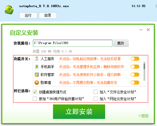 这个安装过程,让我惊喜交加,之前反馈过无数次让它不要再这样流氓了,什么都给你偷偷捆绑装上或强制安装,给他的反馈他全部无视掉。总之,现在可选了,但问题也来了,我不相信360会有如此觉悟,它肯定把更猥琐的行为隐藏在了这些表面之下。同时我也想体验下它有什么软件上的新体验。继续走……