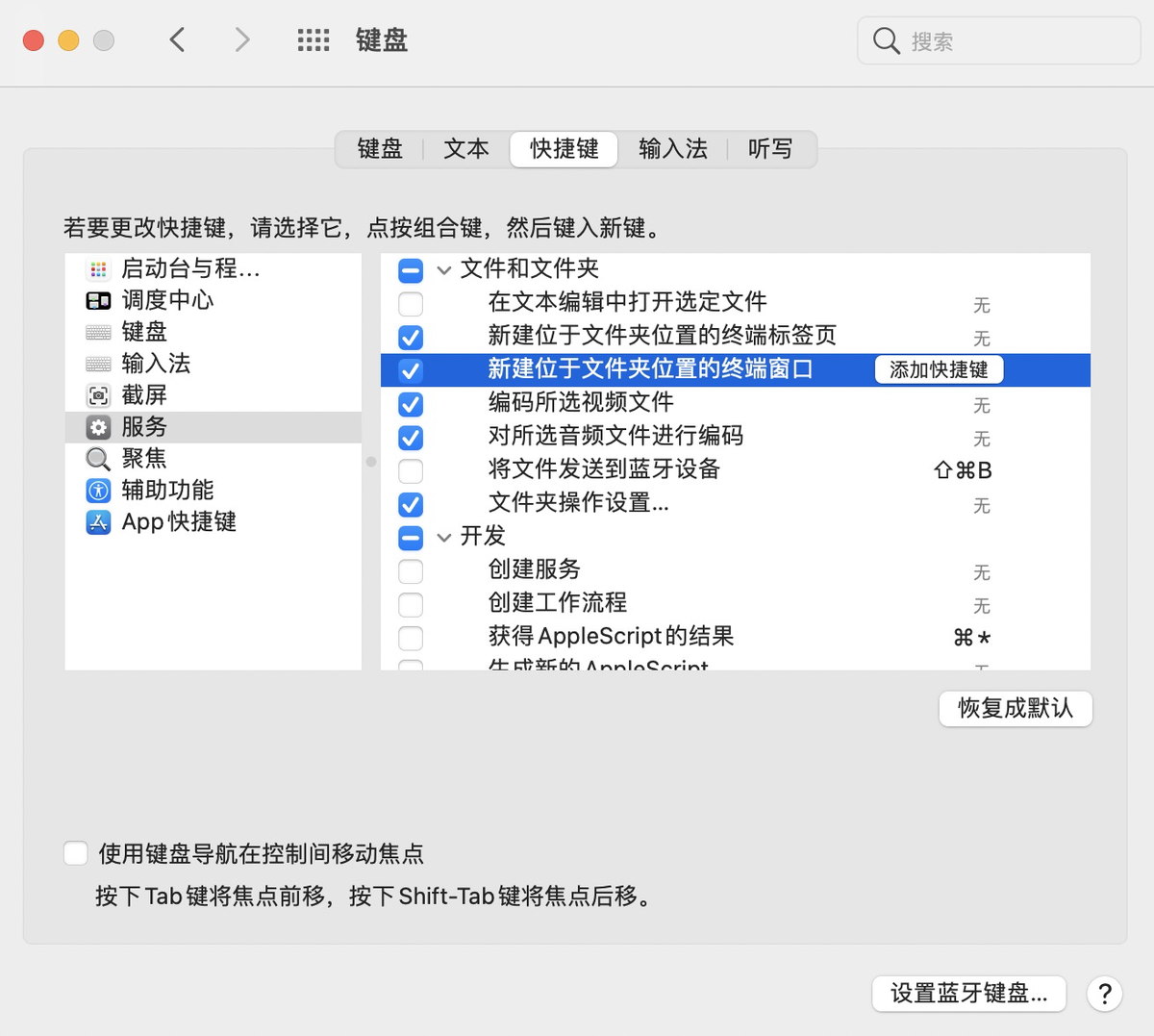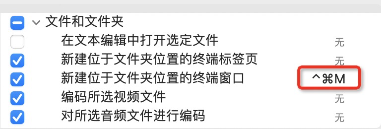 - 快捷键 -> 新建位于文件夹位置的终端窗口 -> 添加快捷键;