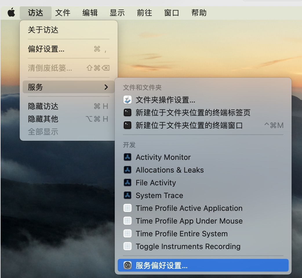 - 访达 -> 服务 -> 服务偏好设置;
