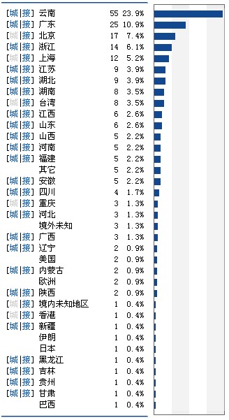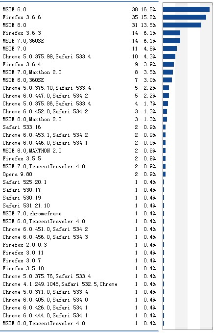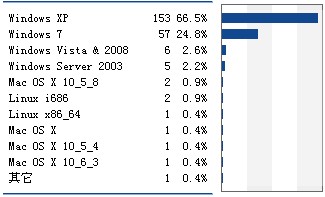 悲惨啊,IE6还是那么嚣张,不过还好,FF在不断的上爬,希望有一天FF成为最终标准最大的用户体,其实从上边的图可以看出来的,一线城市占的比例比较大,第一那位不用说,系统的话XP和WIN7;之前我的统计是国外的流量要比国内的比例大,不知道原因。现在转过来了,很感谢GG,再次BS百毒的阳痿。