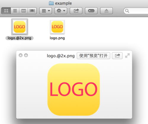 这种专为优化而生的图片有一套现在常用的命名规范,那就是在后面加一个@2x后缀。例如pic.@2x.png将会是pic.png的优化版本,它的大小将会是后者的两倍,但是我们希望它是以原大小的比例来显示出来。