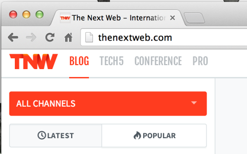 有时候你可能会注意到,如果直接把一个图片,比如Logo,按50%尺寸显示,可能会出现失真的情况,所以你也可以直接用SVG来制作一些简单的但需要多处使用的图片,这样子你就可以一个文件走天下,自由缩放到任意大小,不必再幸苦的去创建各种尺寸了。例如著名的TheNextWeb网站就采用了SVG作为logo,效果很棒。