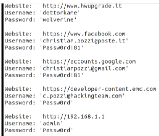 “HACKING TEAM PASSWORDS AND TWEETS.pdf” 里主要保存了Christian Pozzi这个人经常去的网站的账号以及密码以及twitter的截图。估计他就是那个被黑了电脑的人了,因为这个人的电脑被黑,连带着HT内网git服务器,知识库,邮件服务器的数据全部都被dump下来了。