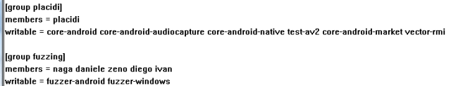 gitosis-admin-master.zip里保存了git服务器上成员的public key以及每个人负责的项目,通过”gitosis.conf”就可以大概知道哪个项目是谁在做了。比如placidi这个成员主要做android相关的项目。Naga, daniele, zeno, diego, ivan这几个人组要做fuzzer。Matteo, zeno, daniele这几个主要做病毒查杀检测。