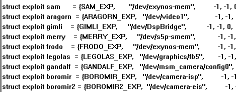 在应用加固方面,这个RSC app除了使用了DexGuard进行混淆,还有虚拟机检测功能。根据开发日志,这个项目貌似还使用很多0day的trick对应用进行混淆。非常值得以后慢慢研究。 接下来就是重头戏root了,主要代码都在\core-android-master\RCSAndroid\jni 这个目录下, 上来就能看到” exploit_list.c”这个霸气的文件,里面可以调用各种exp来获取root权限:
