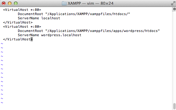 | 1 2 3 4 5 6 7 8 9 10 | <VirtualHost *:80> DocumentRoot "/Applications/XAMPP/xamppfiles/htdocs/" ServerName localhost </VirtualHost> <VirtualHost *:80> DocumentRoot "/Applications/XAMPP/xamppfiles/apps/wordpress/htdocs" ServerName wordpress.localhost </VirtualHost> |