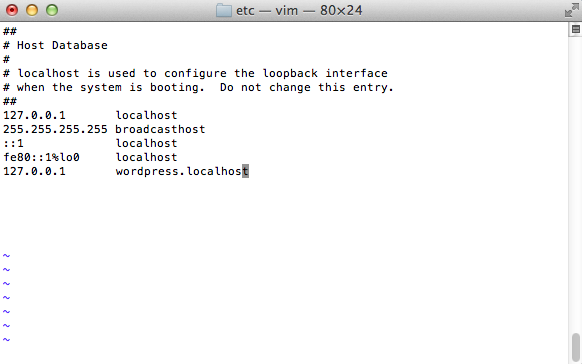 This takes care of mapping the wordpress.localhost domain name to the local machine, which always has the IP address 127.0.0.1.