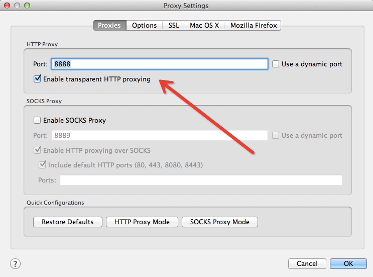 打开Charles->Proxy->Proxy Setting,设置代理端口为8888,并勾选Enable transparent HTTP proxying。
