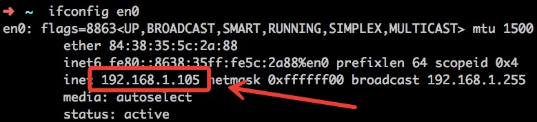 打开终端,输入命令:ifconfig en0 找到里面的IP地址: