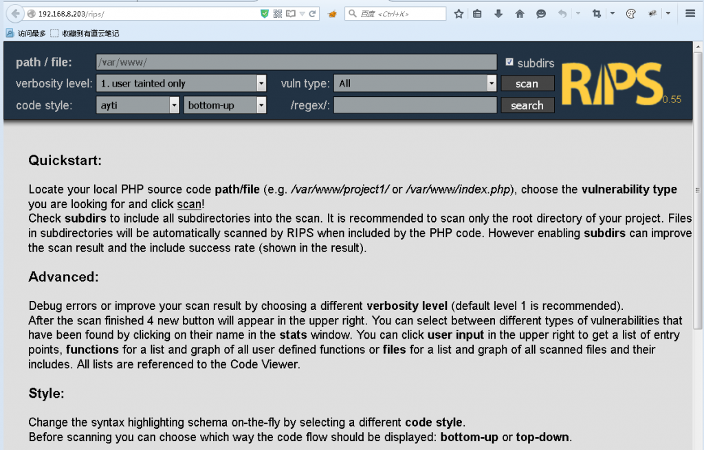 解压下载的zip文件到Web服务器网站目录下即可。在浏览器中输入Web服务器地址和对应目录,RIPS工具的用户使用界面如下: