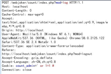 将POST包中Cookie中的count_admin改为“’ or 1=1 #”,即可绕过cookie校验,直接进入后台。