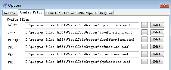 在Settings->Options->Config Files选项中可以对每种语言的扫描配置文件进行编辑。