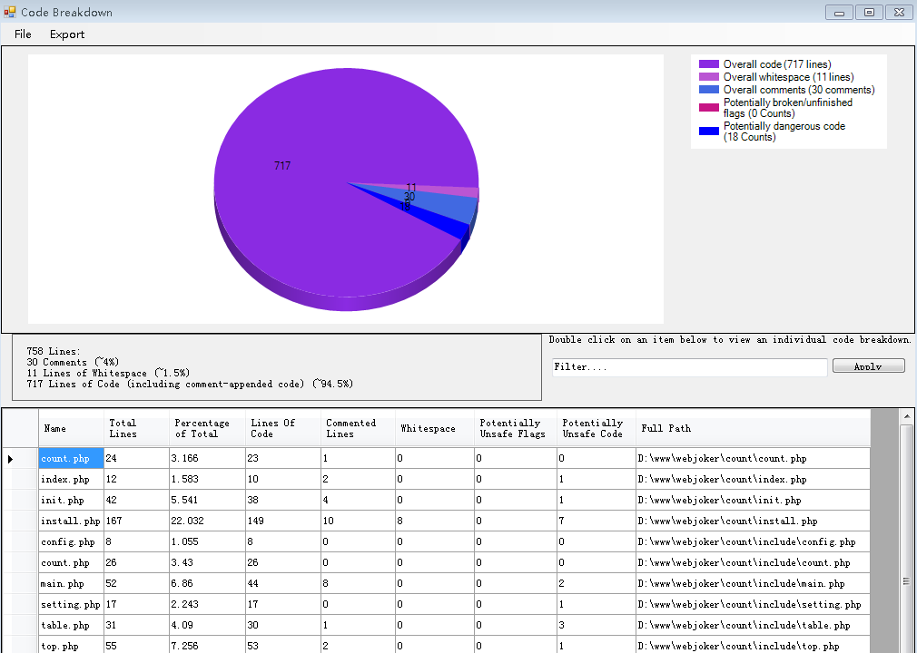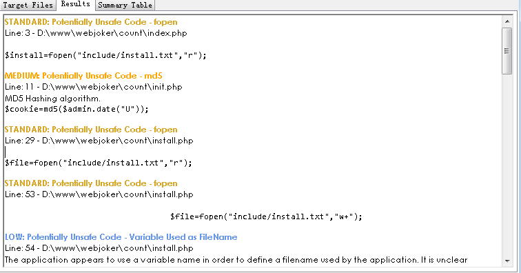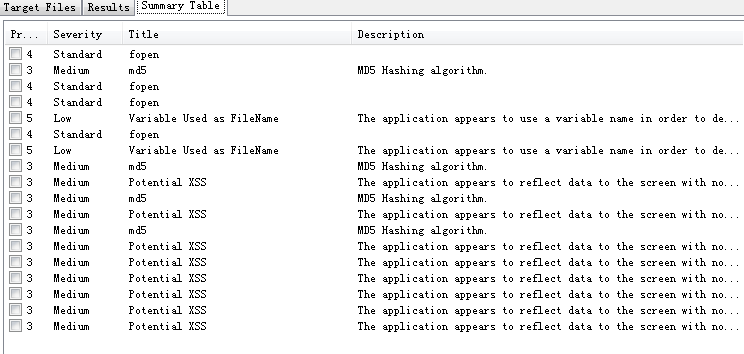 扫描结果以图标的形式对被扫描文件的数据做一个统计,这个功能有点鸡肋。我们重点关注Results和Summary Table两个面板显示的内容。