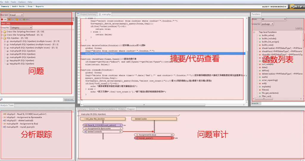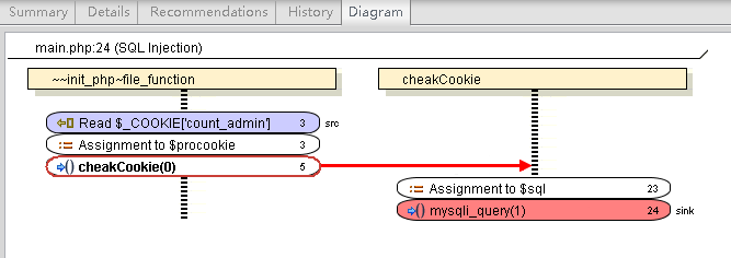 左侧每一个图标的含义在使用手册上可以查到。点击其中每一行,自动定位到对应的源代码行。同时在问题审计面板的Diagram中,有更为形象的数据流向图,直观展示了漏洞产生的原因。