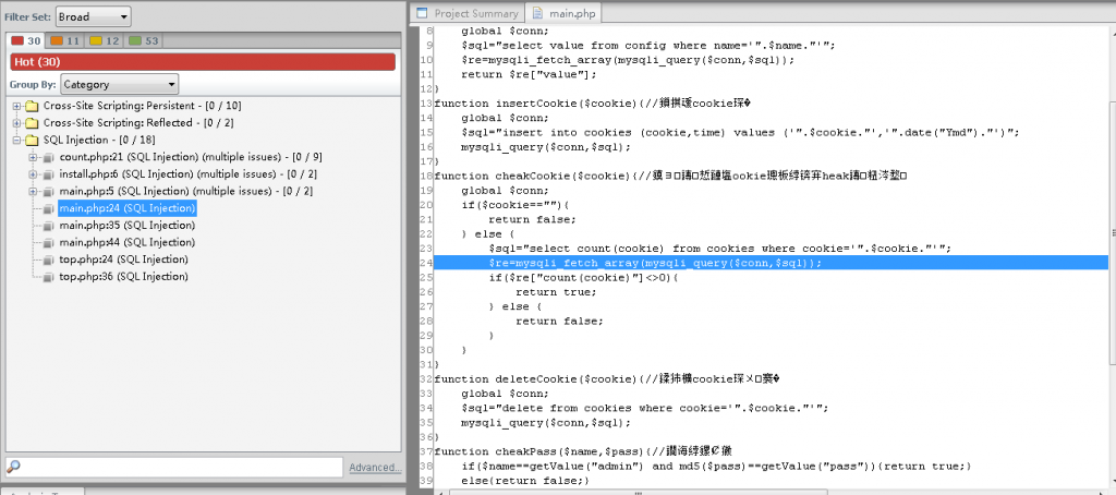 我们来看跟RIPS审计结果同样的SQL注入问题。点击左侧问题,源代码面板自动定位到出现问题的源代码行。