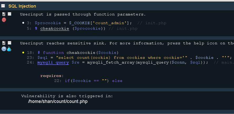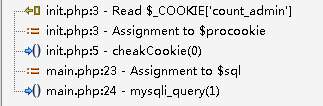 分析跟踪面板显示了详细的数据走向。从COOKIE读入->赋值给变量$procookie->带入cheakCookie()函数->赋值给变量$sql->带入mysqli_query()函数执行。