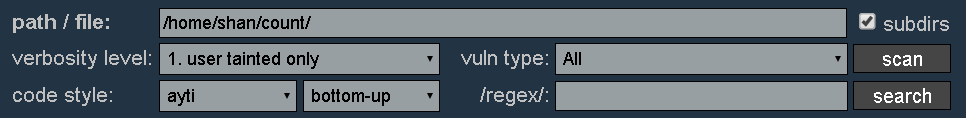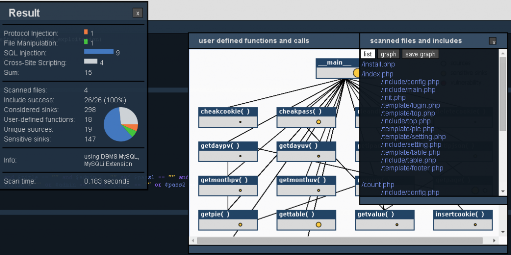 该PHP应用程序用来统计某网站的用户访问情况,登录到程序后台可以查看详细访问信息。将下载后的程序解压,在RIPS的“path/file”选项中填入程序解压目录,其它选项保持默认,点击“scan”按钮开始扫描任务。