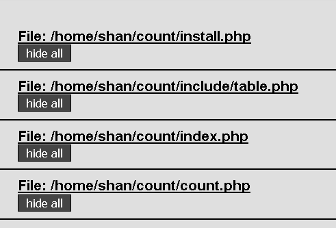 正文部分显示扫描出漏洞的详细情况,点击“hide all”按钮可以查看/隐藏每个文件的详细漏洞结果列表。