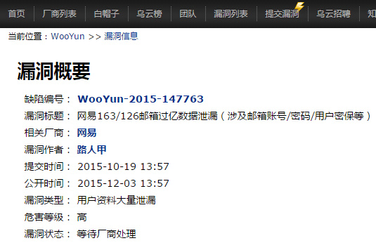 同样遭漏洞爆料的还有网易邮箱。乌云爆料称:网易的用户数据库疑似泄露,影响数据总共数亿条,泄露信息包括用户名、MD5密码、密码提示问题/答案(hash)、注册IP、生日等。网易邮箱绑定的其他账户也受到波及,如iPhone用户的Apple ID等。