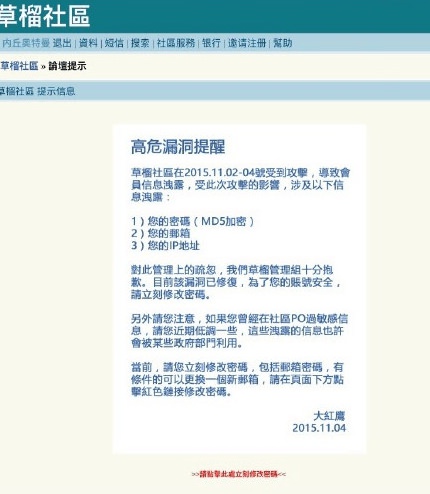 11月初,著名成人论坛草榴社区发生异常无法登陆,一时间网上鬼哭狼嚎;随后草榴发布公告,表示论坛遭到攻击导致数据库外泄,泄露内容包括:登陆邮箱、密码和登陆IP等。据了解,1024用户量在千万左右,且多为20岁以上的社会中坚力量,其数据泄露的影响难以估计。有网友戏称“CSDN脱裤我可以当作没看见,小米脱裤我也无所谓,10086泄密我都不怕,这次我真的怕了……”