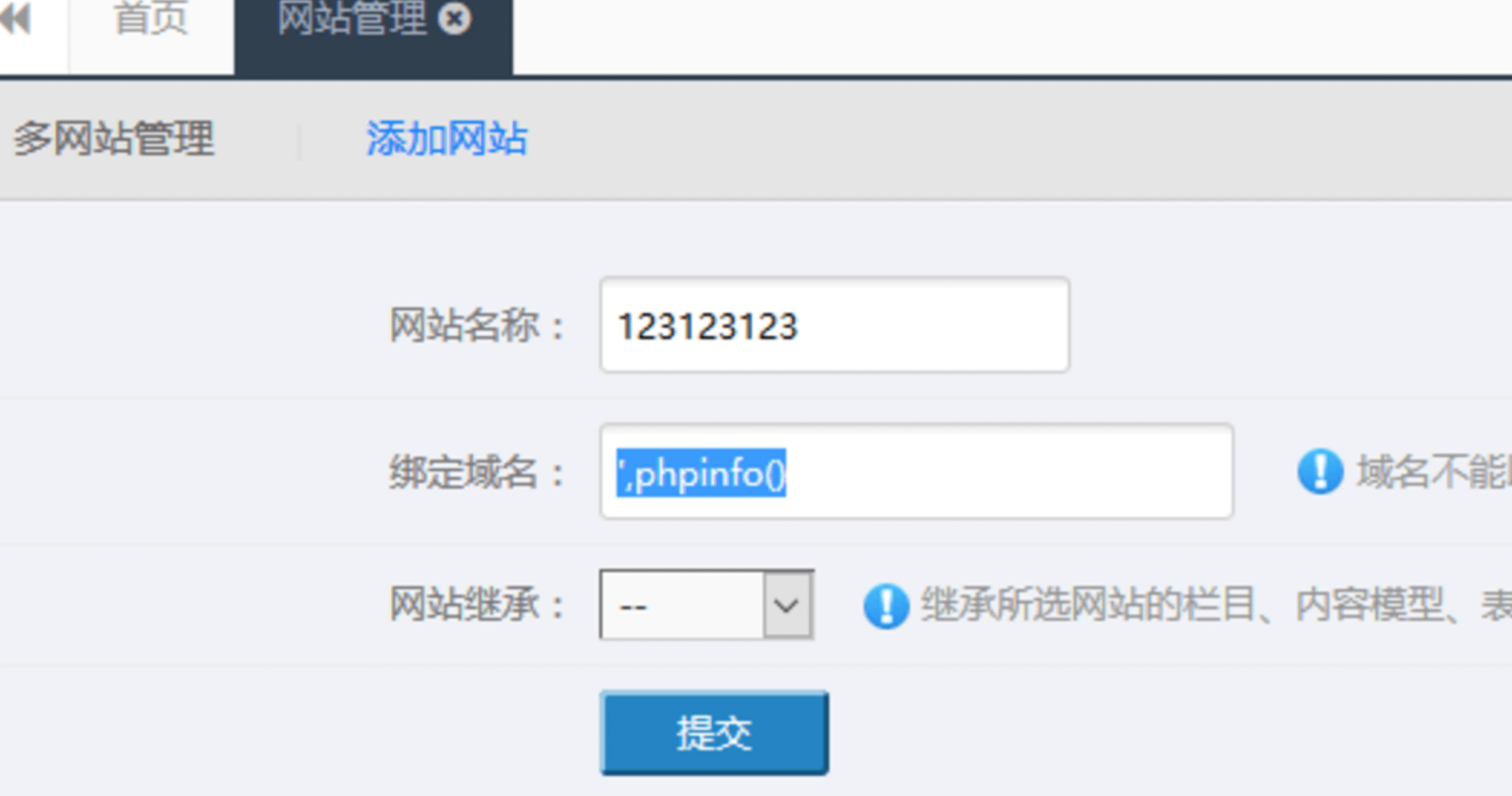 网站名称随便写,绑定的域名写为’,phpinfo()