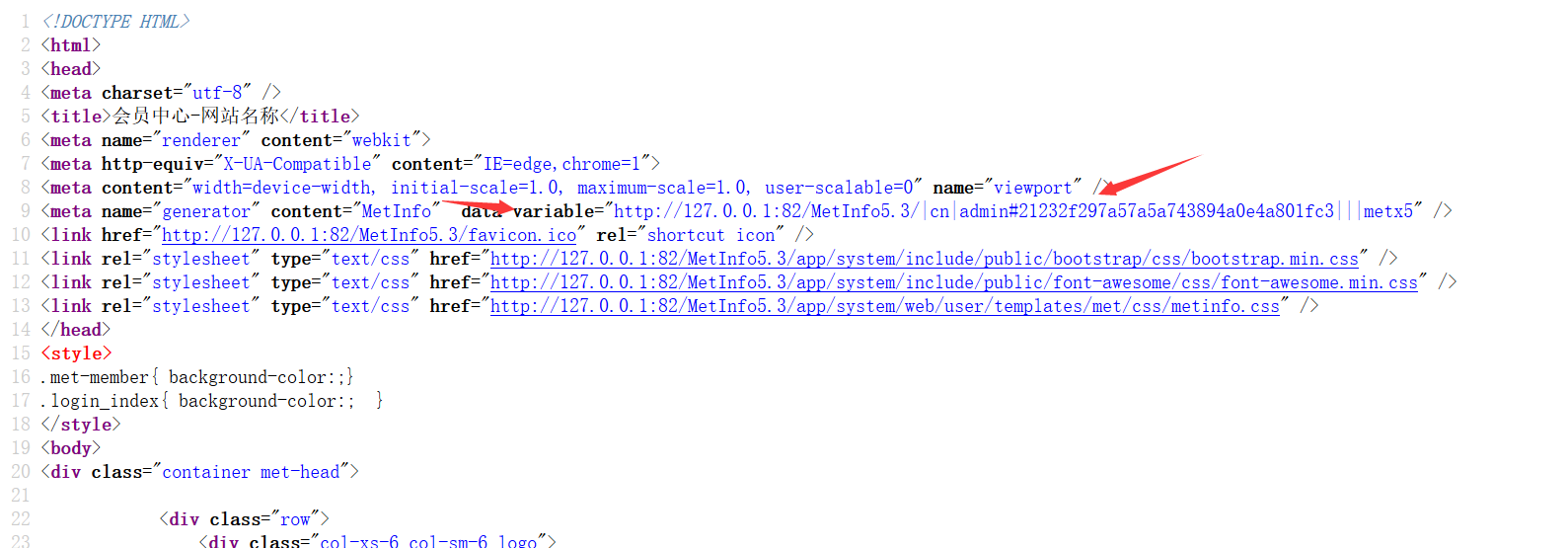 | 1 2 3 4 5 6 7 8 9 10 11 | <html> <head> <meta charset="utf-8" /> <title>{$_M['tem_data']['title']}</title> <meta name="renderer" content="webkit"> <meta http-equiv="X-UA-Compatible" content="IE=edge,chrome=1"> <meta content="width=device-width, initial-scale=1.0, maximum-scale=1.0, user-scalable=0" name="viewport" /> <meta name="generator" content="MetInfo" data-variable="{$_M[url][site]}|{$_M[lang]}|{$classnow}|{$id}|{$class_list[$classnow][module]}|{$_M[config][met_skin_user]}" /> <link href="{$_M['url']['site']}favicon.ico" rel="shortcut icon" /> <link rel="stylesheet" type="text/css" href="{$_M['url']['pub']}bootstrap/css/bootstrap.min.css" /> |