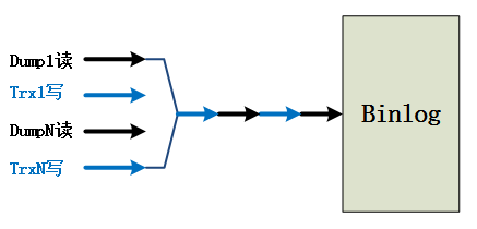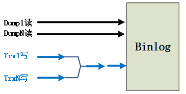 如上图所示,在原生MySQL中多个事务提交线程TrxN和多个Dump线程之间会同时竞争Binlog文件资源的保护锁,多个事务提交线程对Binlog执行写入,多个Dump线程从Binlog文件读取数据并发送给Slave。所有的线程之间是串行执行的!