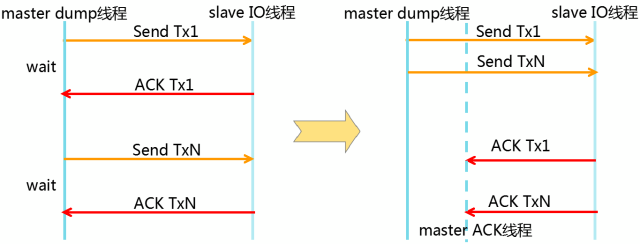 如上图所示,在原生MySQL中主备库之间的数据发送和ACK回应是简单的串行执行,在上一个事件ACK回应到达之前,不允许继续发送下一个事件;这个行为在跨园区(RTT 2-3ms)的情况性能非常差,而且也不能很好地利用带宽优势。
