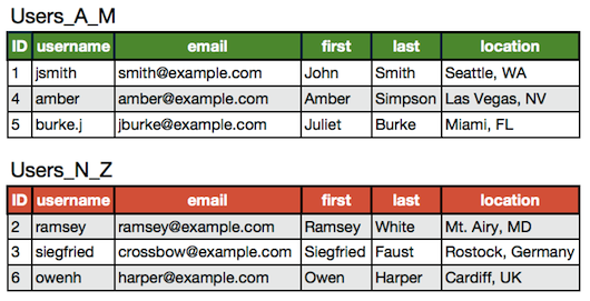 前面垂直拆分的用户表如果进行水平拆分,结果是: