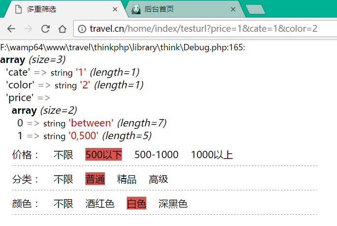 | 1 2 3 4 5 6 7 8 9 10 11 12 13 14 15 16 17 18 19 20 21 22 23 24 25 26 27 28 29 30 | <?php namespace app\home\controller; use think\Request; class Index extends Controller() { public function testUrl(){ $request = Request::instance(); if($request->isGet()){ //get到选项 $request->get('cate') ? $map['cate'] = $request->get('cate') : ''; $request->get('color') ? $map['color'] = $request->get('color') : ''; switch ($request->get('price')) { case 1: $map['price'] = ['between', '0,500']; break; case 2: $map['price'] = ['between', '500,1000']; break; case 3: $map['price'] = ['gt', '1000']; break; } dump($map); } return $this->fetch(':testurl'); } } |